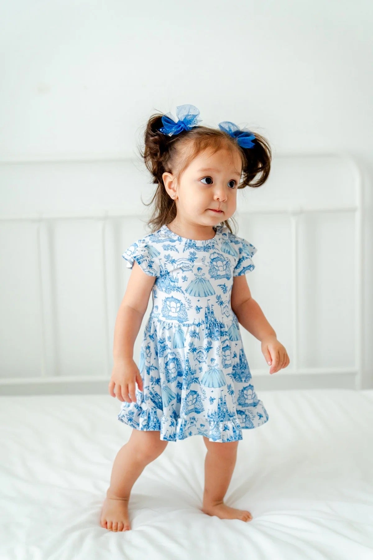 Silky soft white bodysuit twirl dress with blue Cinderella print.