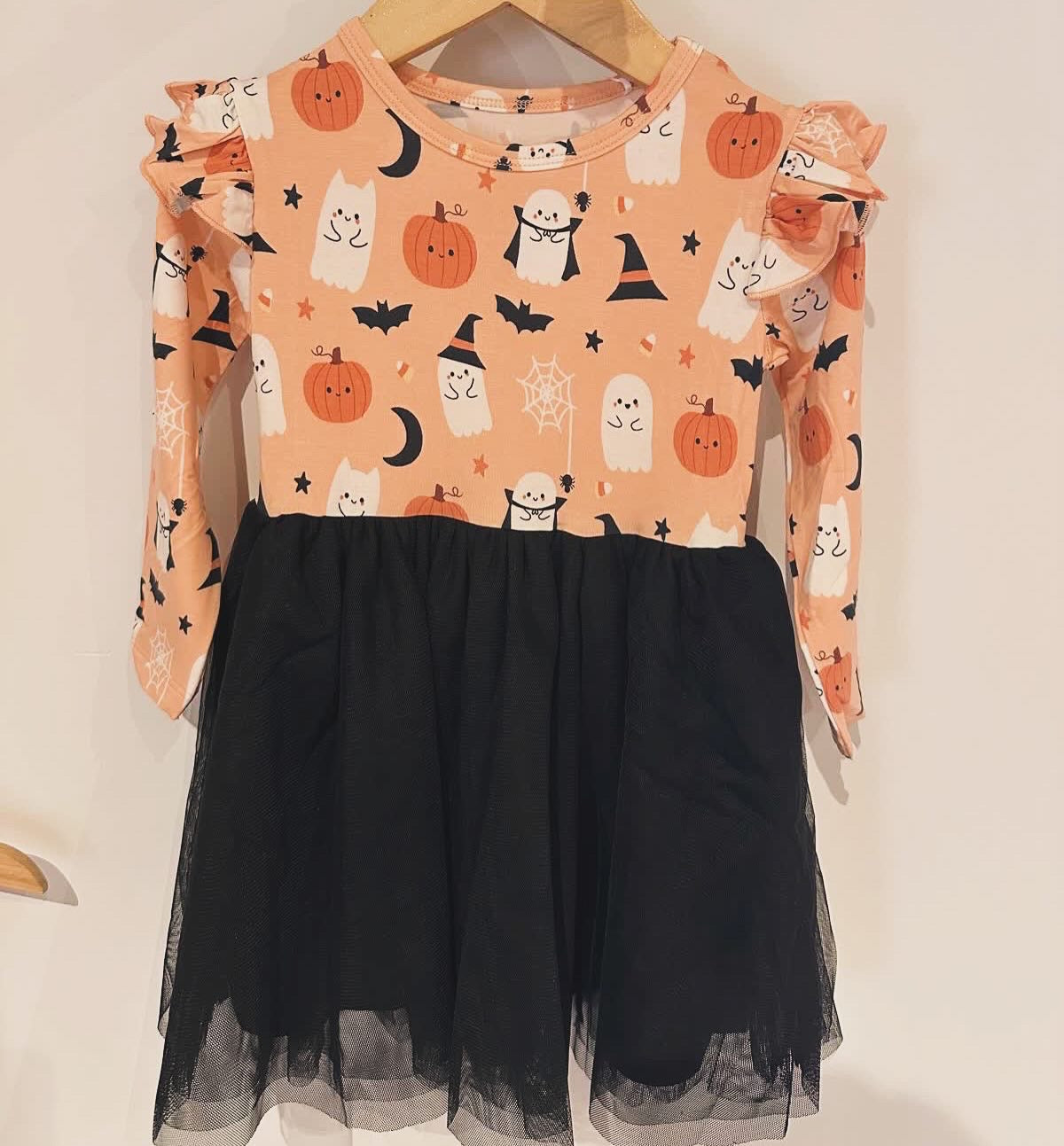 Boo-Tastic Glow-in-the-Dark Halloween Flutter Long Sleeve Tulle Twirl Dress