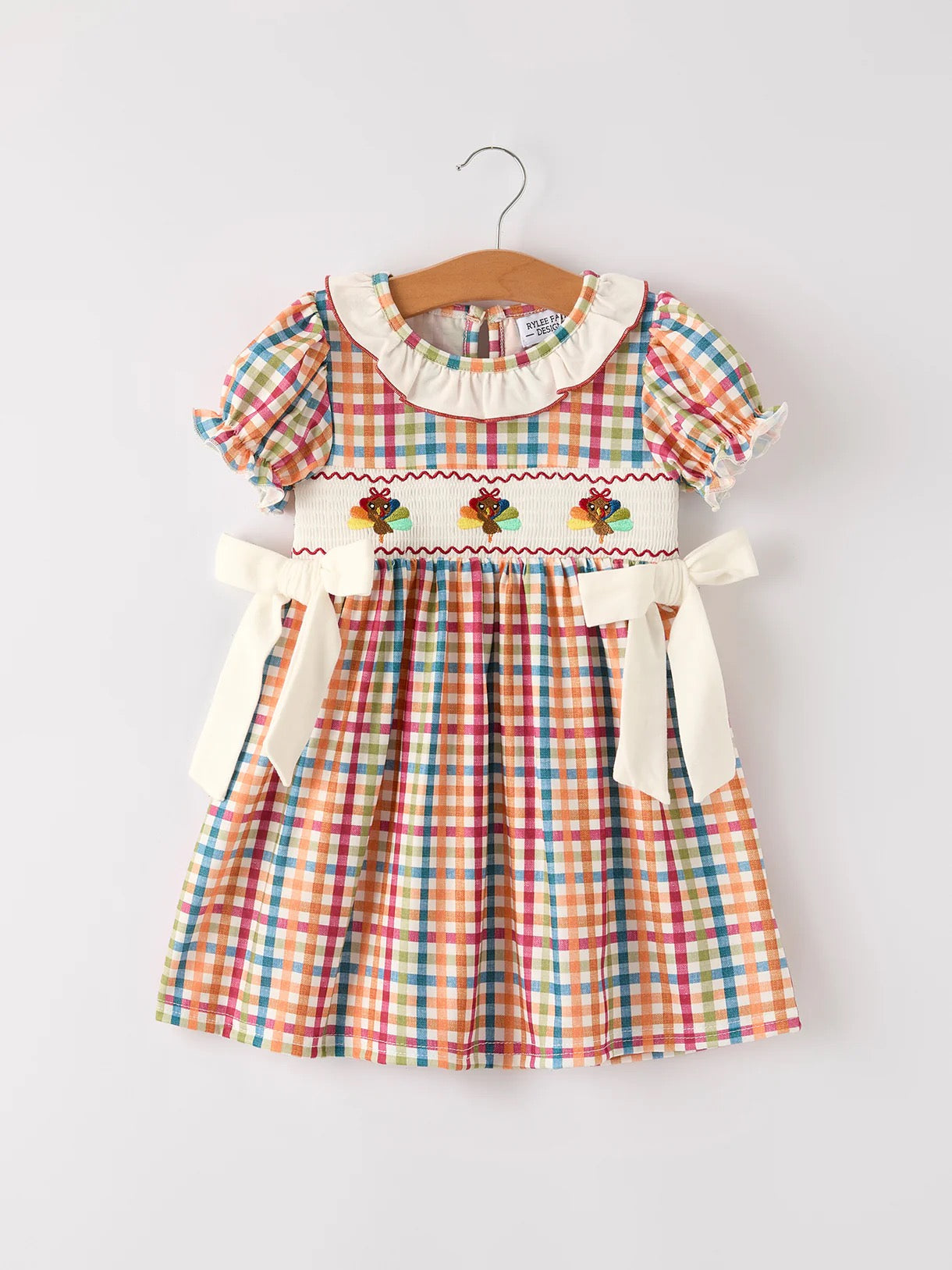 Plaid smock embroidered dress with turkeys and bows.
