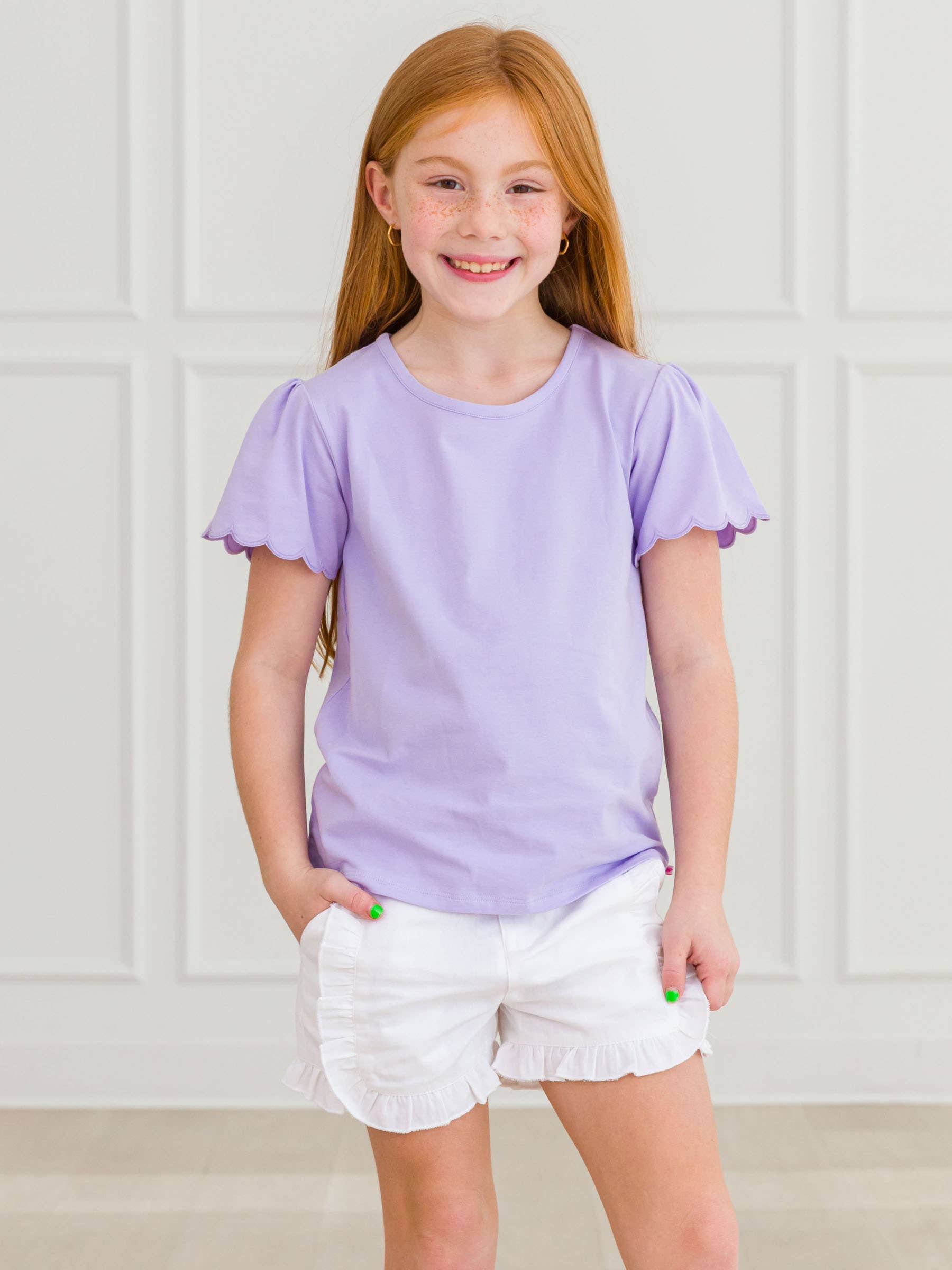 Our super soft Scallop Tee is the perfect staple for your little girls wardrobe! Sweet scallop edge details on the short sleeves elevate this not-so-basic basic.