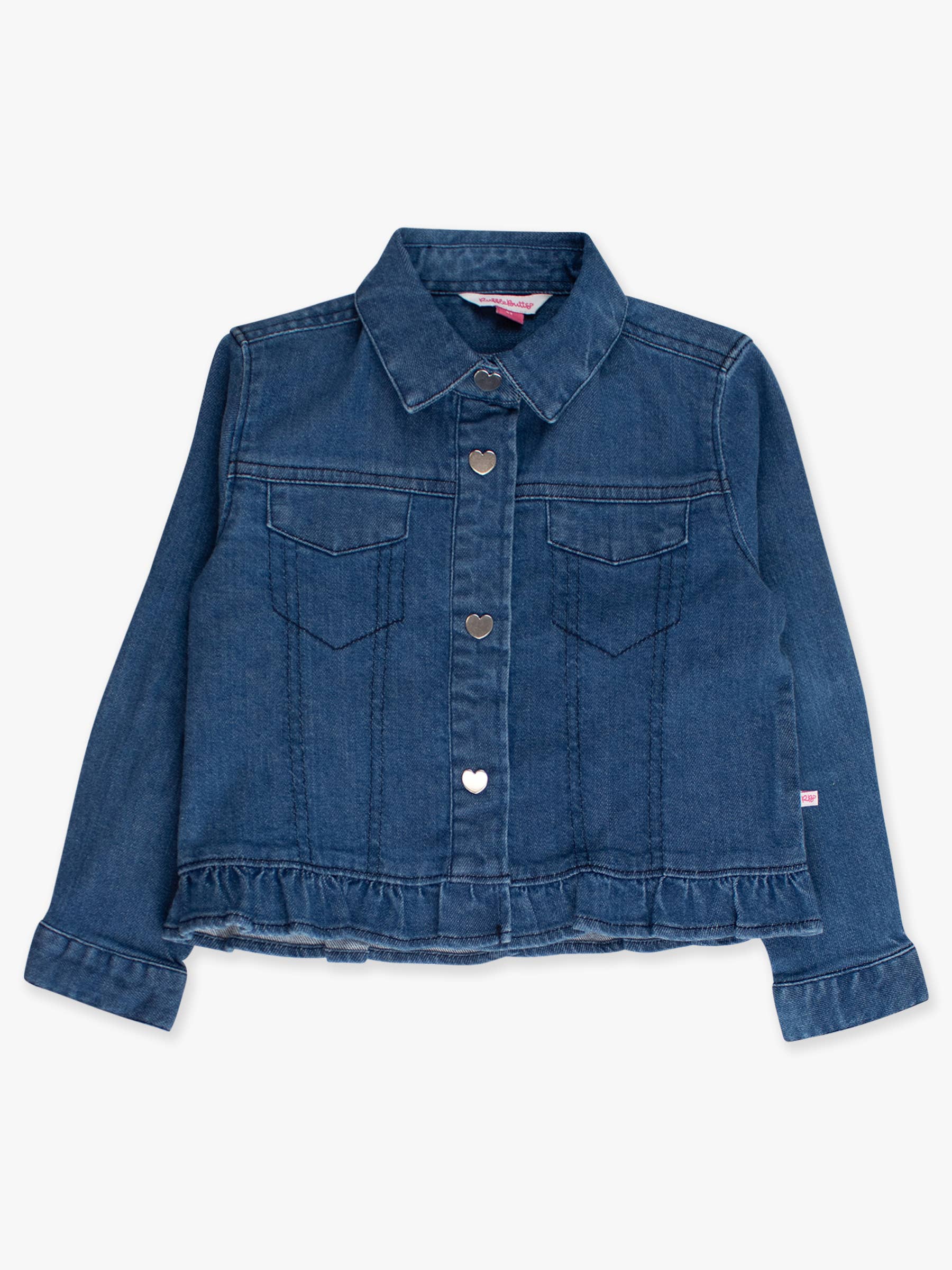 Girls Medium Wash Denim Stretch Denim Ruffle Jean Jacket with Heart Buttons