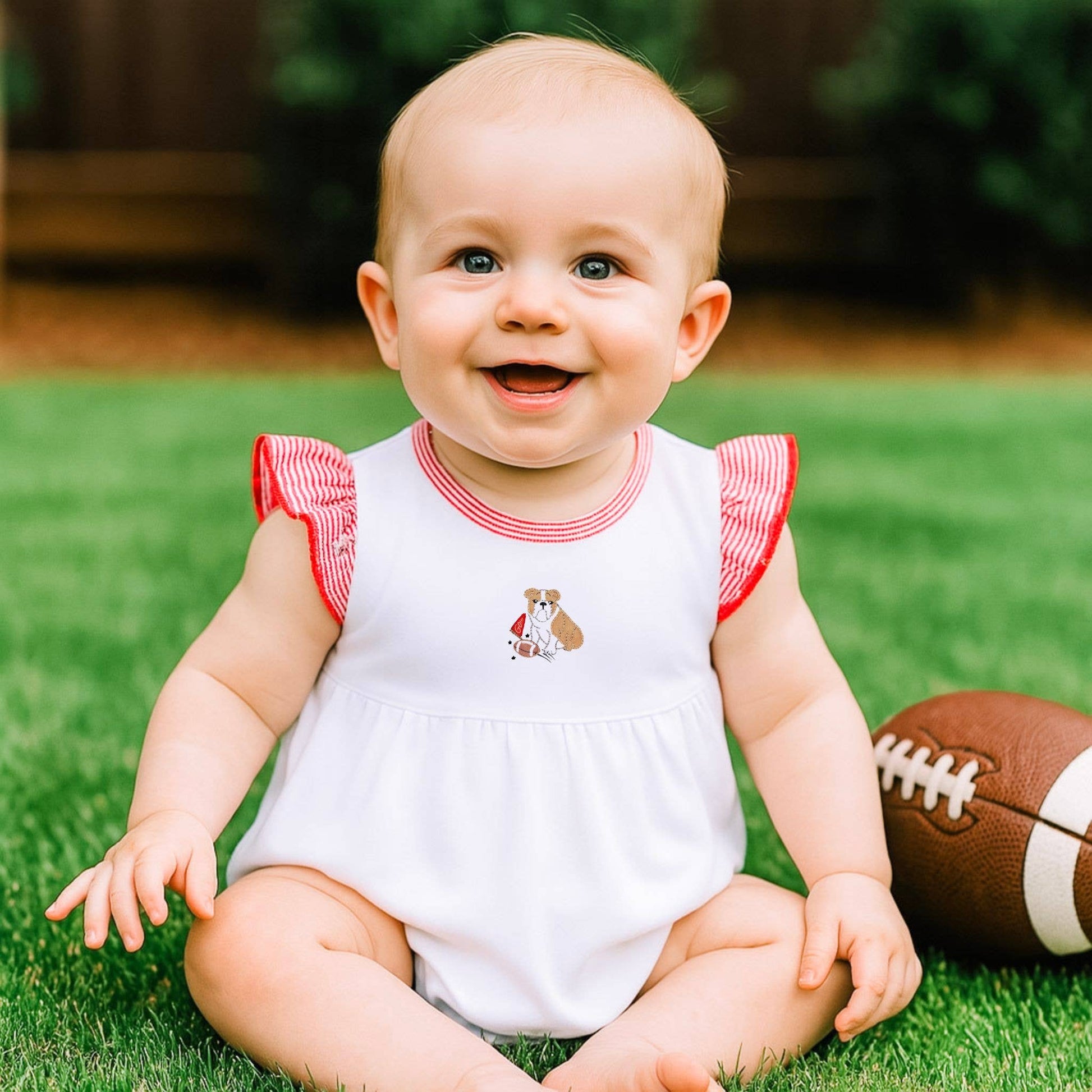 Start their fan journey early with this adorable girl bubble, crafted from luxurious Pima Cotton. It features a playful hand-embroidered bulldog mascot, perfect for game day or cheering on their favorite college football team.