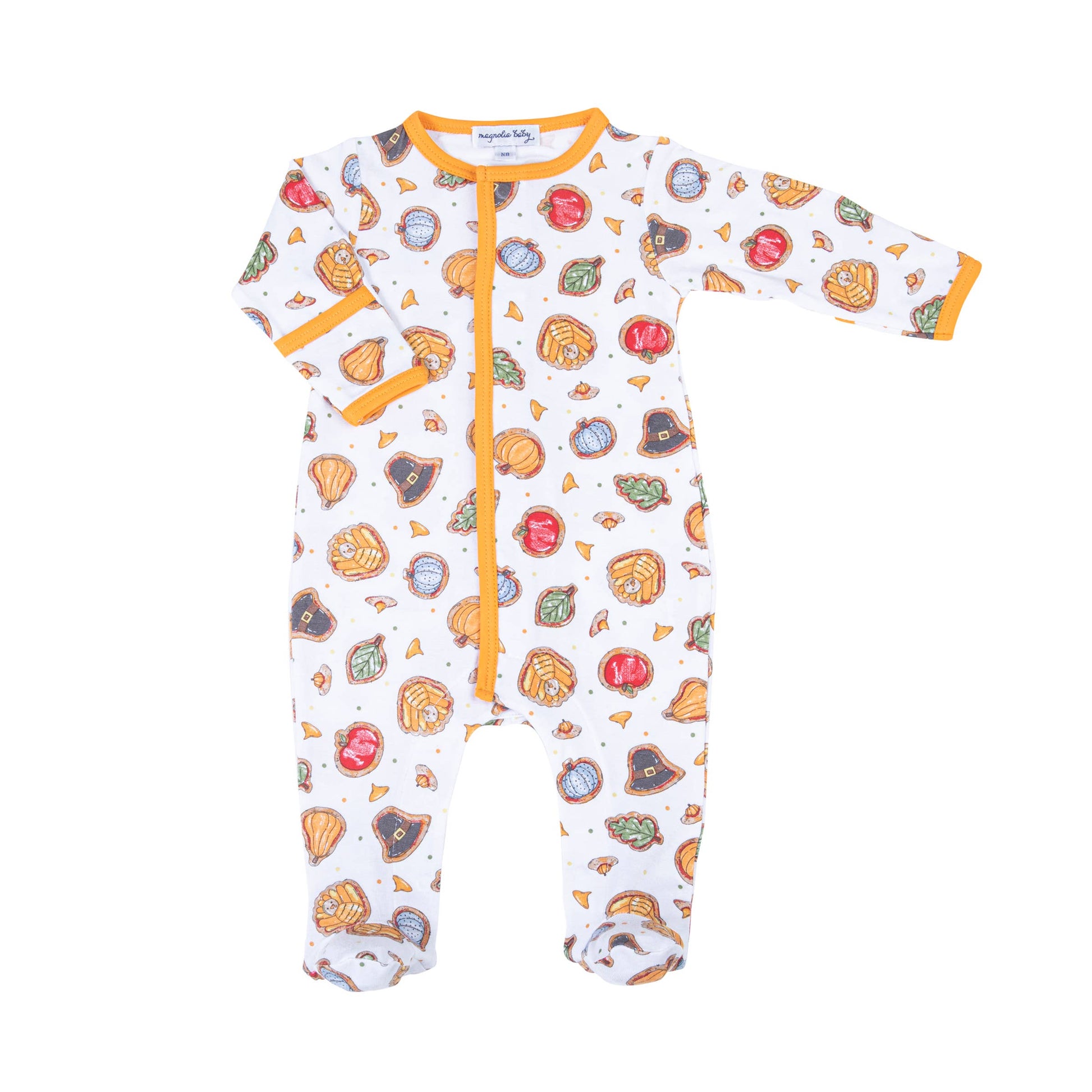 Our Gobble, Gobble Cookies Orange Printed Footie is a delightful addition to your little one's wardrobe. This jumpsuit, from Magnolia Baby, is designed with 97% Bamboo and 3% Elastan, ensuring softness, comfort, and stretch for your baby. The brand, established in 2006, is renowned for its sophisticated designs and high-grade materials. This footie is no exception, embodying Magnolia Baby's commitment to comfort, style, and luxury. Dress your little ones in fresh, stylish sophistication with this charming footie.