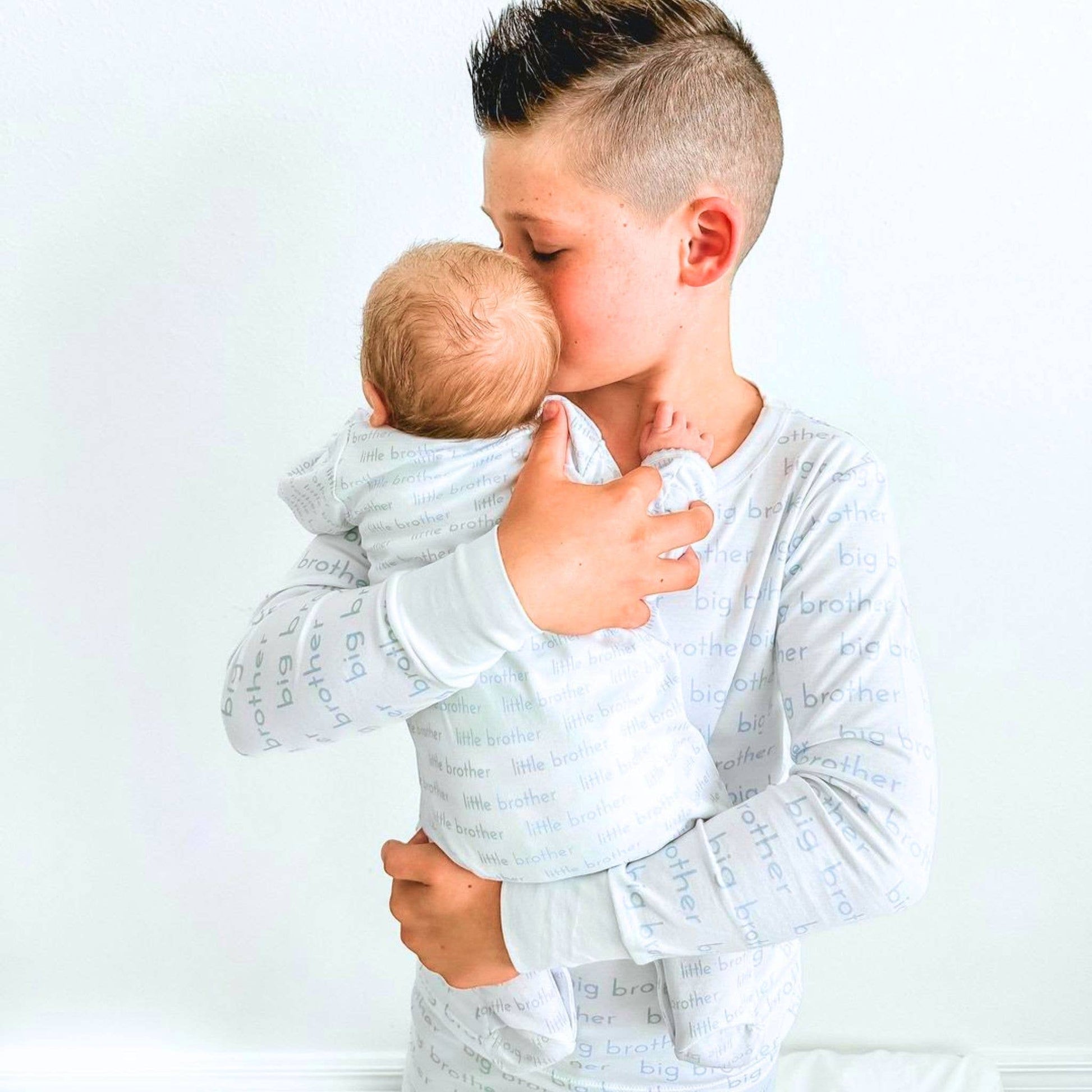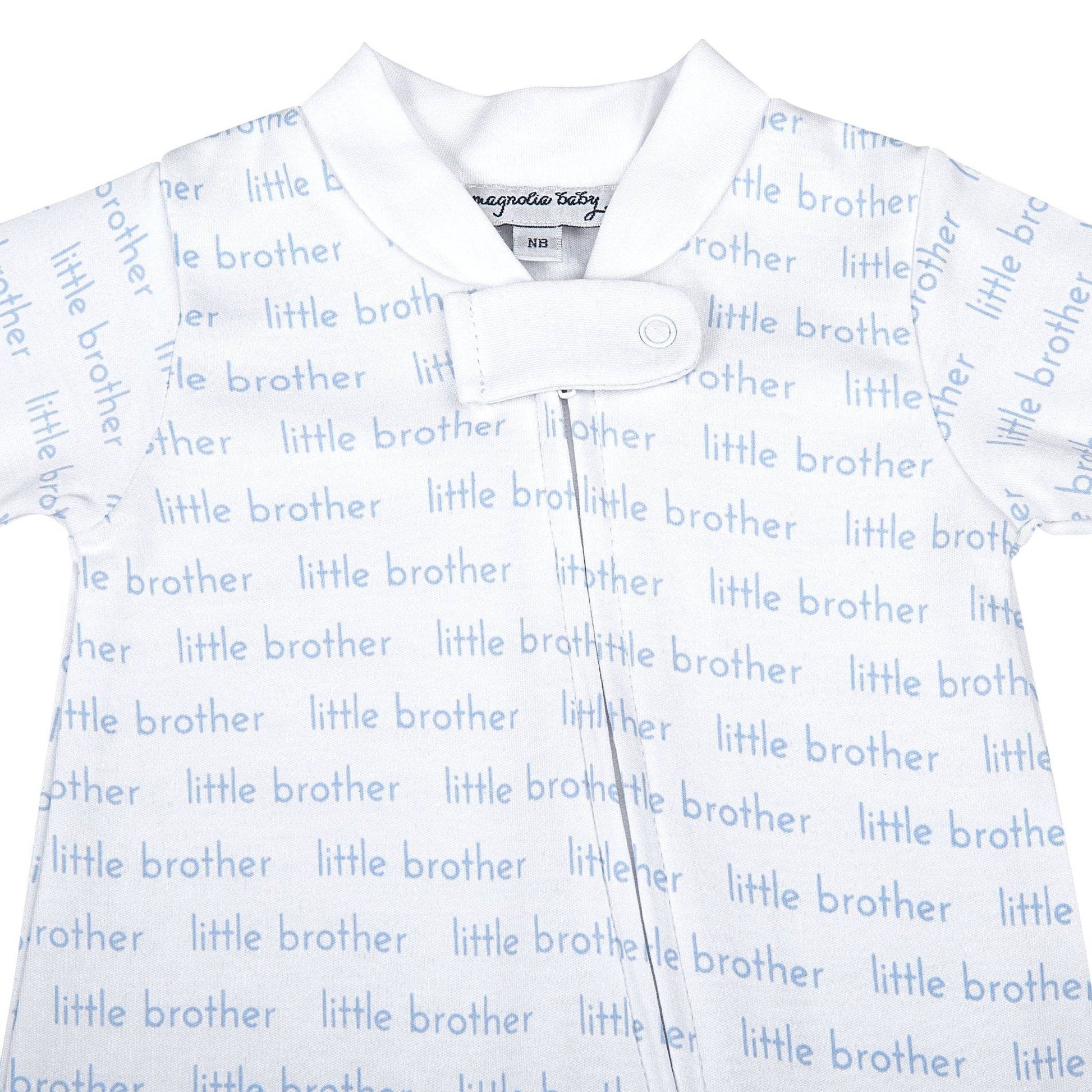 This adorable footie is the perfect way to celebrate the newest addition to your family! Crafted from the softest Pima cotton, it features a charming all-over print of the words "little brother" in a delicate light blue hue, creating a subtle yet stylish pattern. The full-length zipper makes dressing and diaper changes a breeze, while the fold-over cuffs on the hands and feet offer extra warmth and comfort for your little one. The classic collared neckline adds a touch of sophistication to this cozy essential.