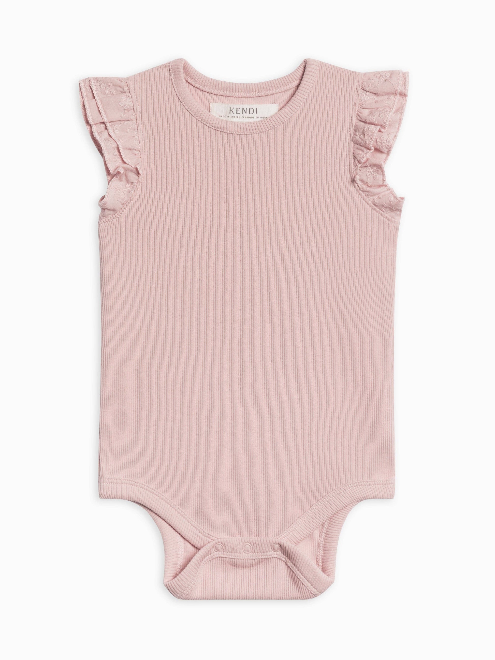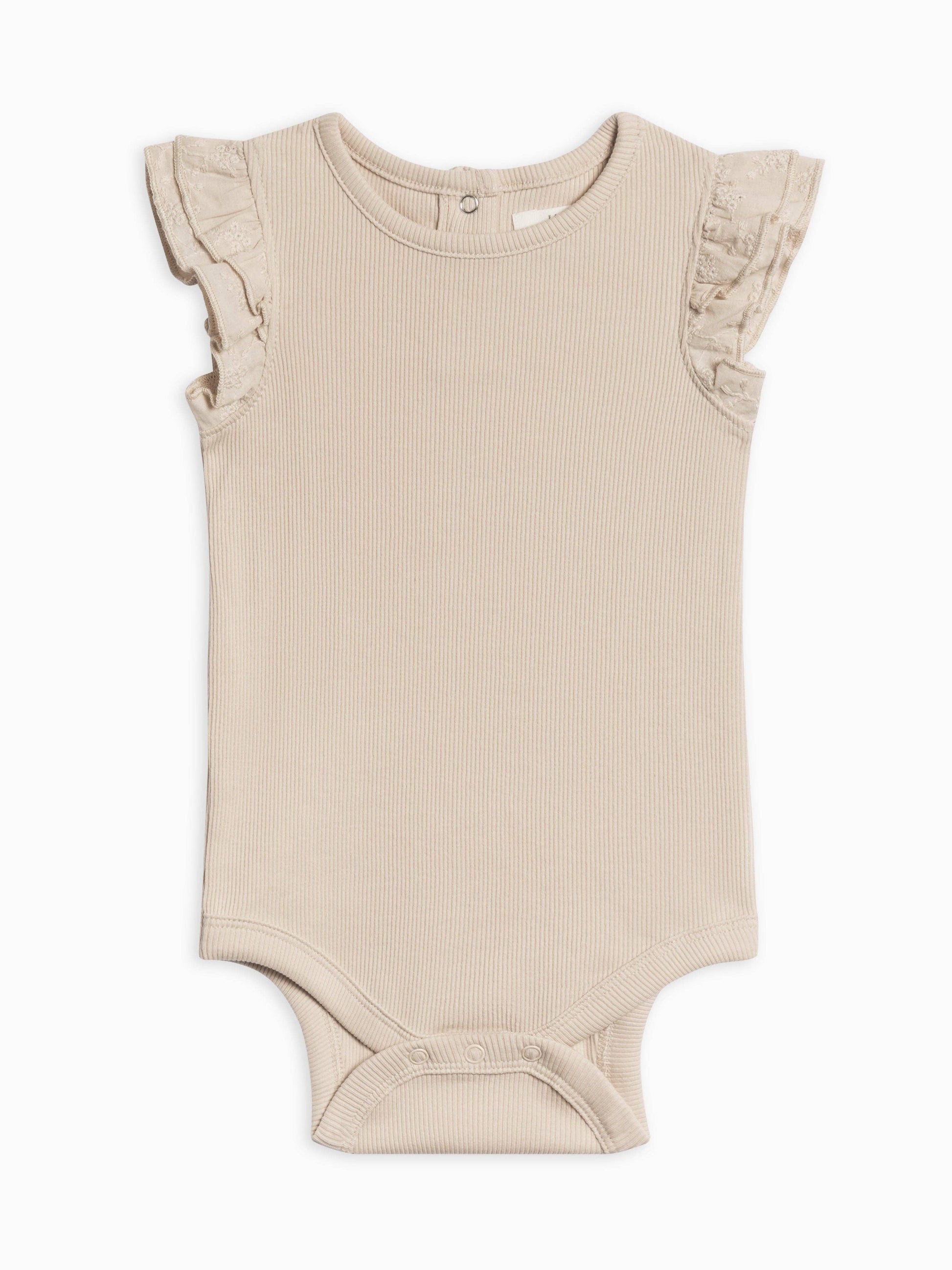 Delicate, comfy, and totally adorable, the Maggie Ribbed Short Sleeve Bodysuit with Eyelet Ruffle is perfect for your baby’s everyday adventures. Crafted from a soft organic cotton ribbed fabric, this bodysuit features sweet eyelet ruffle sleeves that add a touch of charm. The back features a snap placket to ensure easy dressing, and the snap leg opening makes diaper changes a breeze. Whether it's a playdate in the park or a family outing, the Maggie Bodysuit offers the perfect blend of style and functionality for your little one. Pair this adorable bodysuit with the Lennon Ribbed Leggings or Lydia Ribbed Ruffle Shorts!