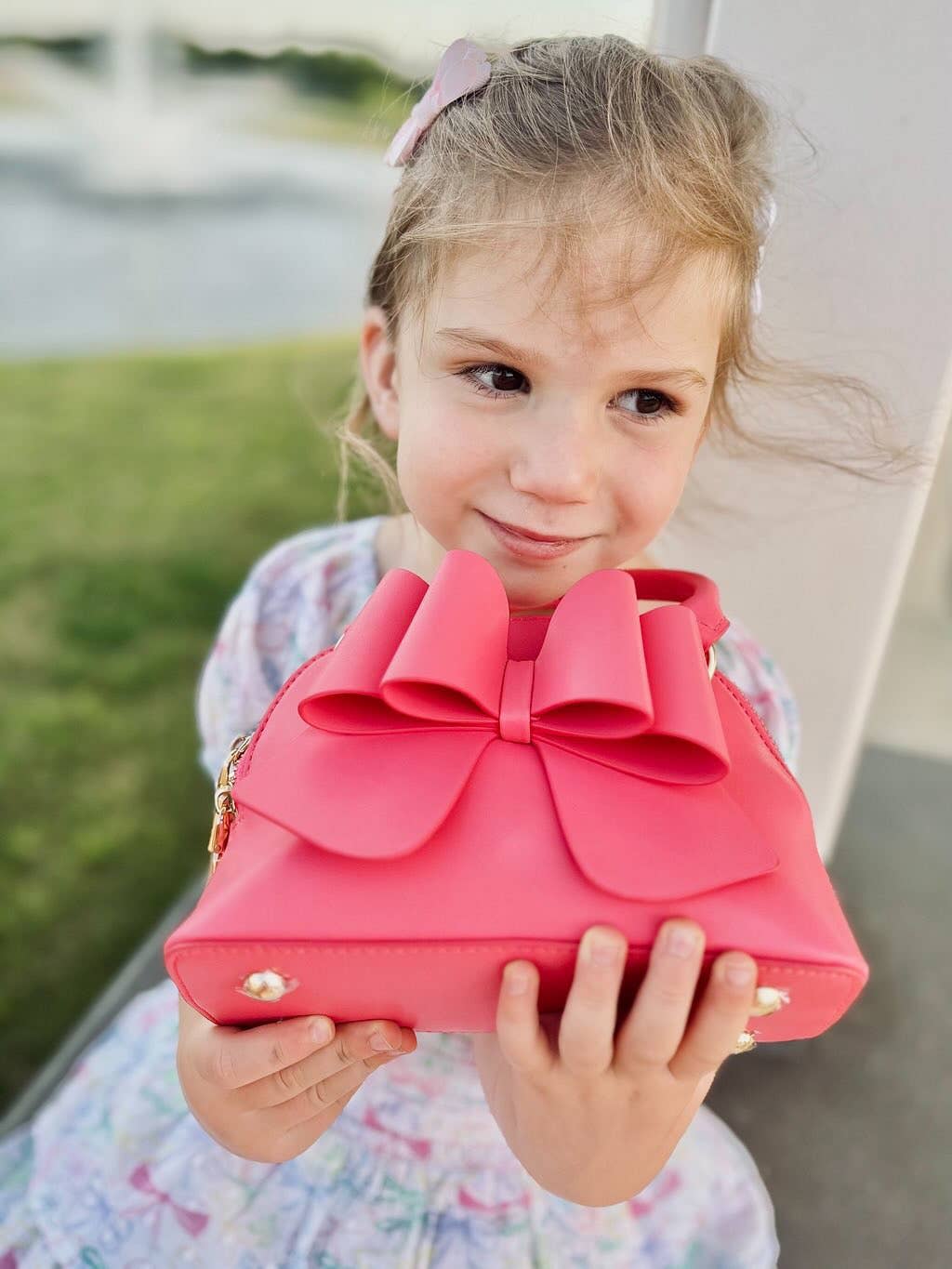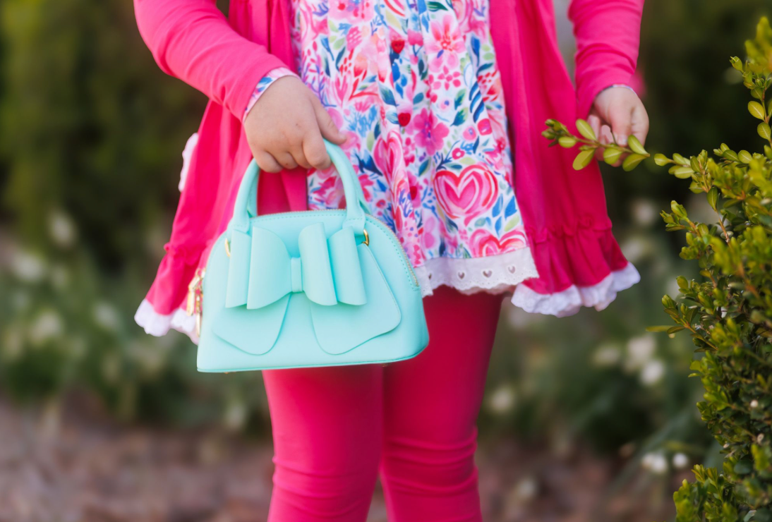 Designed for both style and functionality, the interior includes multiple pockets for easy organization and is lined with a custom floral print. It also comes with a matching kid-sized crossbody strap and beautiful gold hardware!