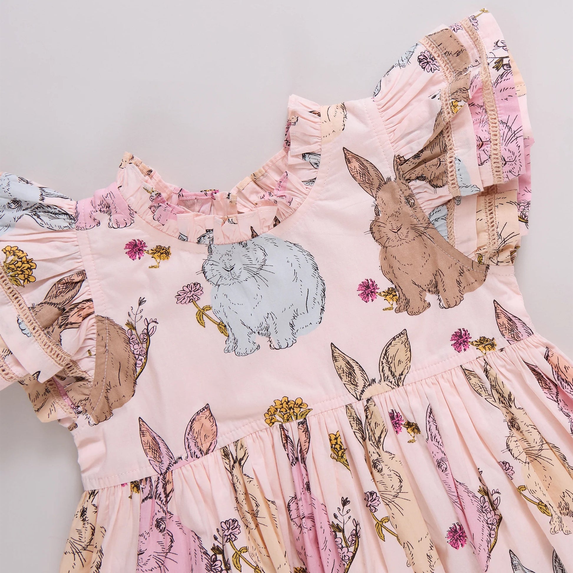 A brand new Easter favorite made for twirling! This new silhouette features our pink vintage bunny print in soft 100% cotton poplin. Designed with double ruffle sleeves, a sweet ruffle collar, and a delicate ladder trim inset at the bodice, this dress is full of charming details that make it extra special for spring celebrations.