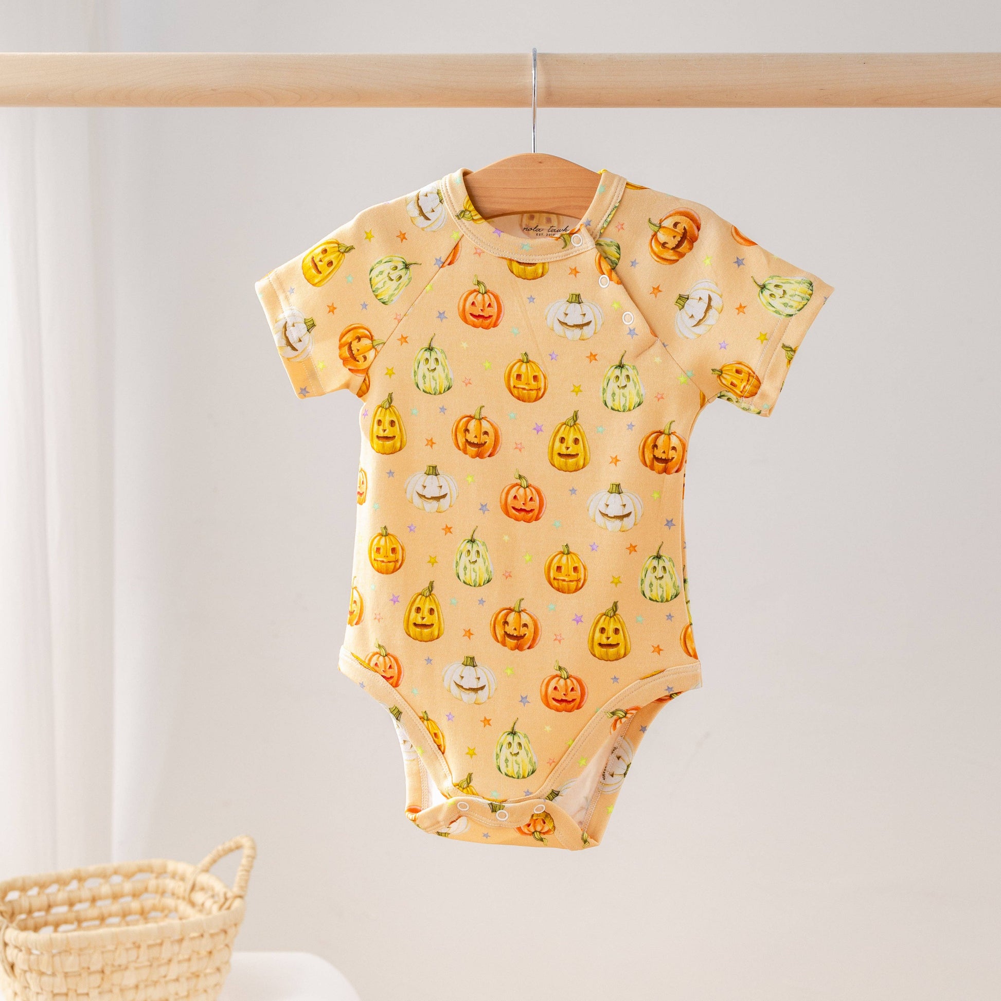 Celebrate the season with our Pumpkin Pals Organic Cotton Baby Onesie! Featuring a playful pumpkin patch print with charming orange, white, and green jack-o’-lanterns, this cozy piece is made for fall outings, seasonal photos, and everyday comfort. Perfect for pumpkin patch trips, Halloween festivities, or cozy cuddles at home, it adds a festive autumn touch to your little one’s wardrobe.