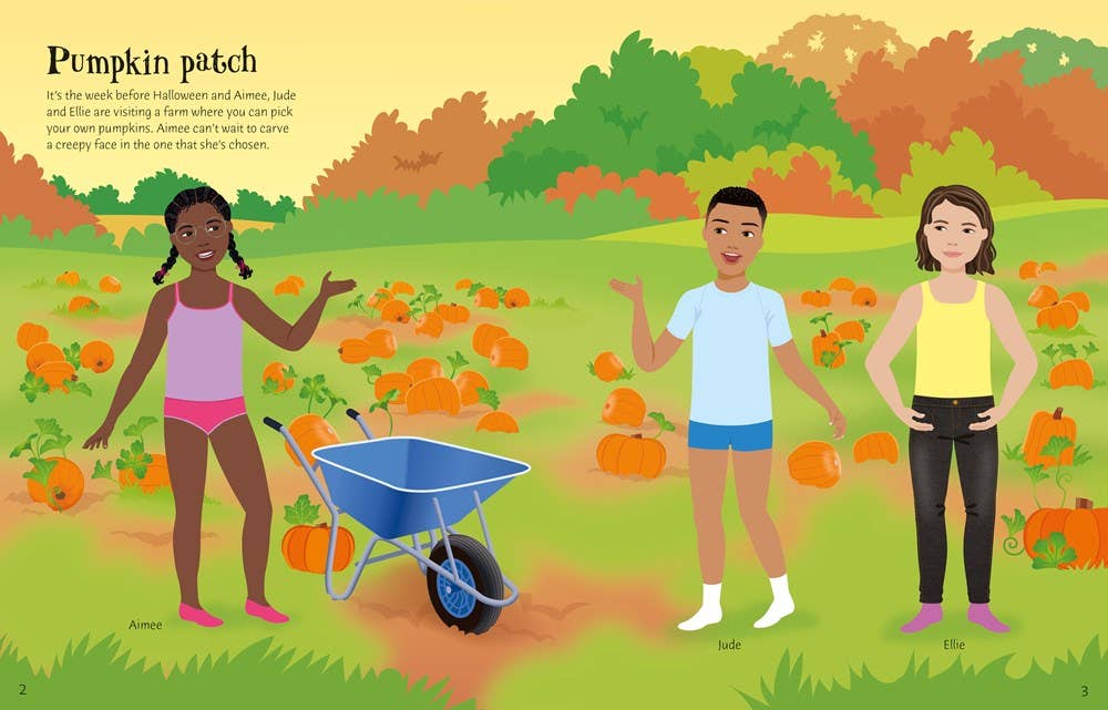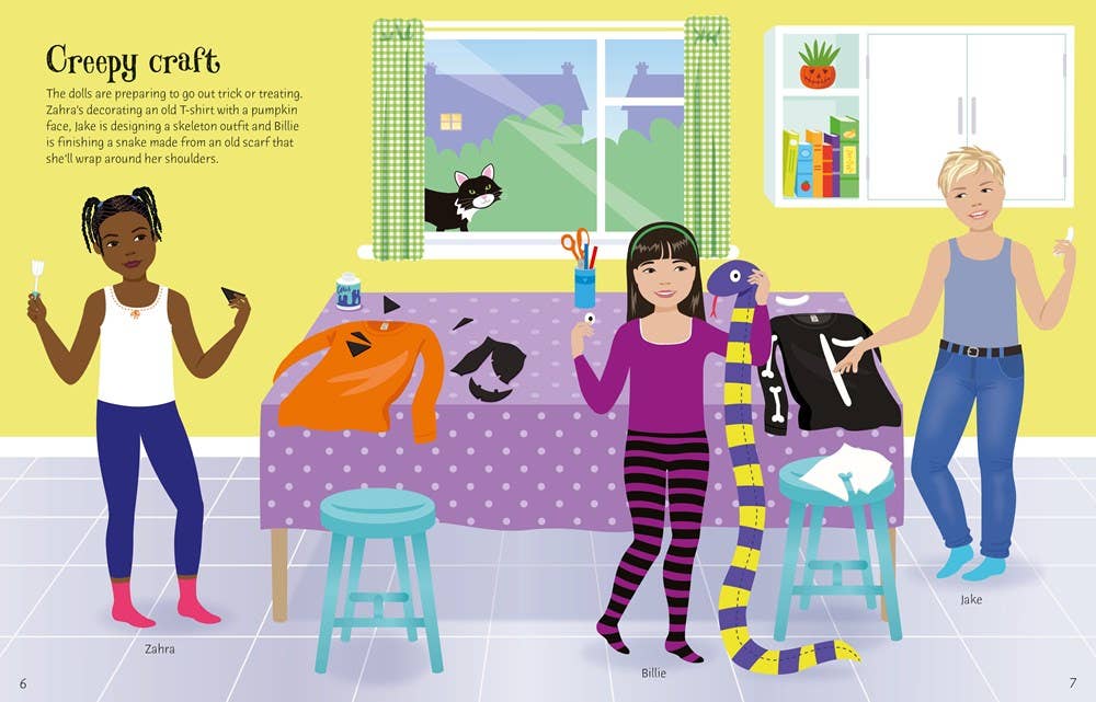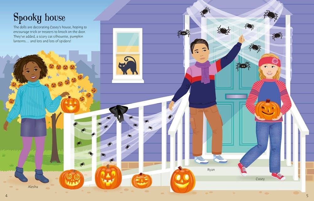 Discover the world of Sticker Dolly Dressing ! Have fun choosing the stickers for the dolls' outfits as they prepare to go trick-or-treating. Scenes include carving pumpkins, performing a witchy dance, some scary animals, spooky scarecrows, an 'un-lucky' dip and lots, lots more.. The number 1 bestselling sticker series with characters to dress and colorful scenes to decorate. Over 200 stickers in every book! . With 12 scenes to complete. Easy to remove perforated sticker pages for decorating each scene. Hours of enjoyment to stimulate any child's imagination. Develop children's concentration and fine motor skills. Ideal for ages 5+. 44 pages of screen-free fun!